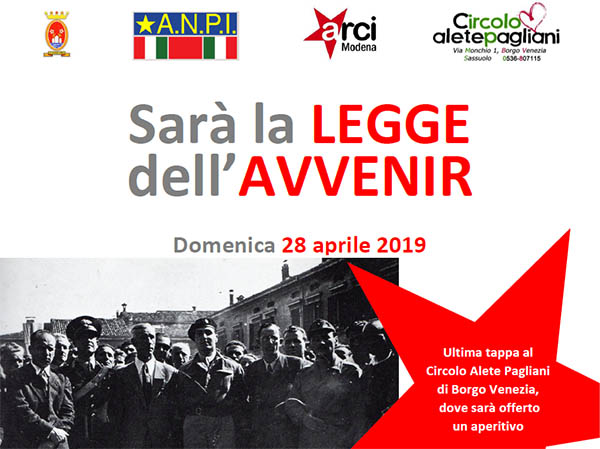 La narrazione storica utilizzerà le tecniche della Public History. I bambini parteciperanno leggendo testimonianze di sassolesi che vissero quegli anni e una scelta di articoli della nostra Costituzione. L’iniziativa è il momento conclusivo del progetto didattico Dai margini alla storia. La partenza è fissata per le ore 16 in piazza Garibaldi e la partecipazione è libera e gratuita. La camminata sarà ripagata da un aperitivo finale offerto dal circolo Arci Alete Pagliani alle ore 18 circa. L’iniziativa ha il patrocinio del Comune di Sassuolo ed è organizzata dal Circolo Alete Pagliani e dagli ideatori del progetto Dai margini alla storia, ovvero Anpi e Arci Modena.