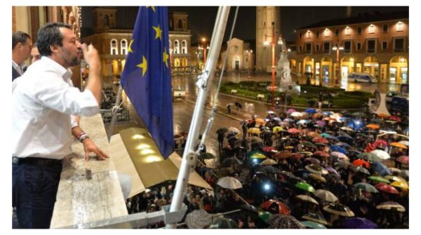 Poi arriva Forlì ed il ministro dell’Interno che è anche segretario della Lega, che è anche ministro del governo che non ha mantenuto nessuna promessa, portato l’Italia in recessione, bloccato gli investimenti e che ha firmato un patto di collaborazione con Putin, si affaccia al balcone dal quale parlò Mussolini, sotto una marea di fischi e di insulti.