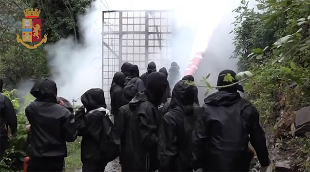 Nella circostanza, mentre un gruppo di facinorosi utilizzando flessibili e lanciando pietre creava un varco nella struttura metallica, circa 100 antagonisti travisati posizionatisi sulla parte alta della montagna lanciavano grosse pietre all’indirizzo dei contingenti di Polizia che si vedevano costretti ad utilizzare alcuni lacrimogeni (nell’occorso rimaneva anche ferito un operatore della Digos), ricompattandosi poi con gli altri nuclei delle forze dell’ordine dislocati nei pressi di un’altra cancellata metallica predisposta invece sul ponte del fiume Clarea a circa 100 metri dal cantiere di Chiomonte.