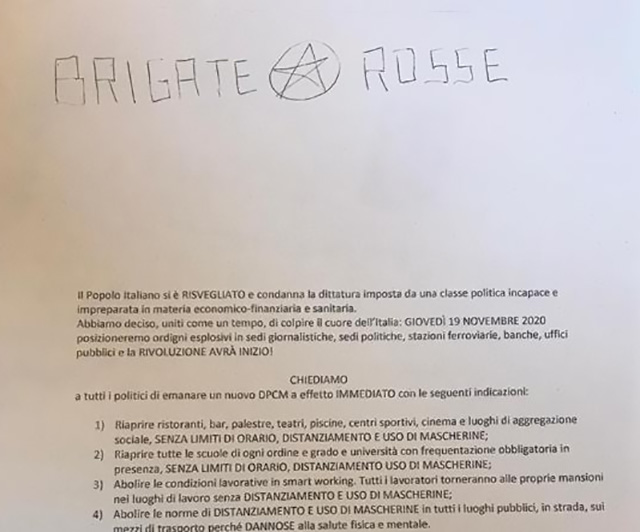 Dunque è di un paio di giorni fa l’invio da parte di sedicenti nuove brigate rosse di volantini di minacce a numerosi Sindaci di diverse città italiane, Ferrara, Modena, Piacenza, Bologna tra le altre; al presidente della Regione Emilia-Romagna Bonaccini e a quello del veneto Zaia tra gli altri; con conseguenti immediato drizzar d’antenne della DIGOS che immediatamente acquisisce il materiale e dà il via alle indagini.