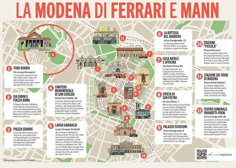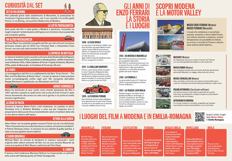 Sono solo alcuni dei luoghi della città che caratterizzano il film “Ferrari” di Michael Mann che da giovedì 7 dicembre sarà nelle sale cinematografiche in anteprima a Modena e a Maranello. E tutti questi luoghi sono riportati in una mappa consultabile sul sito Visitmodena.it (www.visitmodena.it/it/la-modena-di-ferrari-e-di-mann) e disponibile, dal pomeriggio di giovedì, anche al punto di informazione turistica di piazza Grande e nei cinema Victoria e Raffaello dove si proietta il film. Al Victoria è previsto un saluto del sindaco Gian Carlo Muzzarelli prima della proiezione delle 20.30.