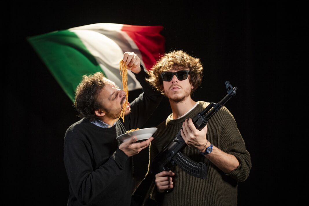 Nicola Borghesi invece riflette sul fatto che la svolta a destra che sta avendo non solo il nostro Paese ma il mondo intero, da una parte lo ossessiona e dall’altra lo turba. Allora insieme a Niccolò Fettarappa decide di provare a entrare in quest’ottica di destra e nel patriottismo, che forse possono dire molto non solo sulla realtà che stiamo vivendo ma anche su noi stessi. «Come possiamo entrare in un’ottica così lontana da noi, così spaventosa? – si chiede Borghesi – Con l’unico strumento che sappiamo un minimo maneggiare: il teatro. Provando, dopo anni trascorsi a fare spettacoli di sinistra, a fare uno spettacolo di destra. Non è un’impresa facile, perché non è facilissimo capire cosa sia la sinistra, ma ancora più difficile è afferrare davvero cosa sia questa nuova destra. Allora abbiamo proceduto per tentativi, sempre fondati sul desiderio e sulla volontà di divertirci in questo gioco di camuffamento. E abbiamo scritto delle scene di destra, senza rinunciare a prendere in giro questo nostro tentativo goffo e noi stessi che mettevamo in campo questo tentativo. Poi ci siamo accorti che tutto questo divertimento ci dava una certa nausea, un certo dolore. Allora abbiamo provato a capire da dove venissero questa nausea e questo dolore. E ci è capitato di pensare che la destra è dentro di noi, in un posto profondo nel quale non andiamo mai a guardare. Ci siamo detti che forse valeva la pena di scavare più a fondo in questo posto profondo e ci siamo accorti che una ricerca che era cominciata con una risata finiva in un’angoscia profonda, in un qualcosa di perturbante perché alieno e familiare al contempo. Così abbiamo pensato che questo movimento – quello che va dall’ironia consunta di chi è sempre al di fuori e al di sopra delle cose al contatto con una parte irrisolta e problematica della nostra identità – dovesse essere anche quello da imprimere a Uno Spettacolo Italiano.».